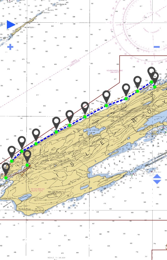 We quietly pushed off just as the sun came up and continued down the north side of the island, gazing at the silent woods, funny skimmer ducks and looking into the clear blue depths of the lake. Rocks would suddenly rise up and our depth finder would beep, informing us that we were once again in water less than 6’ deep. How on earth boats made it through there back before GPS we don’t know. There would have had to be a lot of hectic bearing taking and paper chart plotting but probably most of all they just would have stayed farther out in the deep.