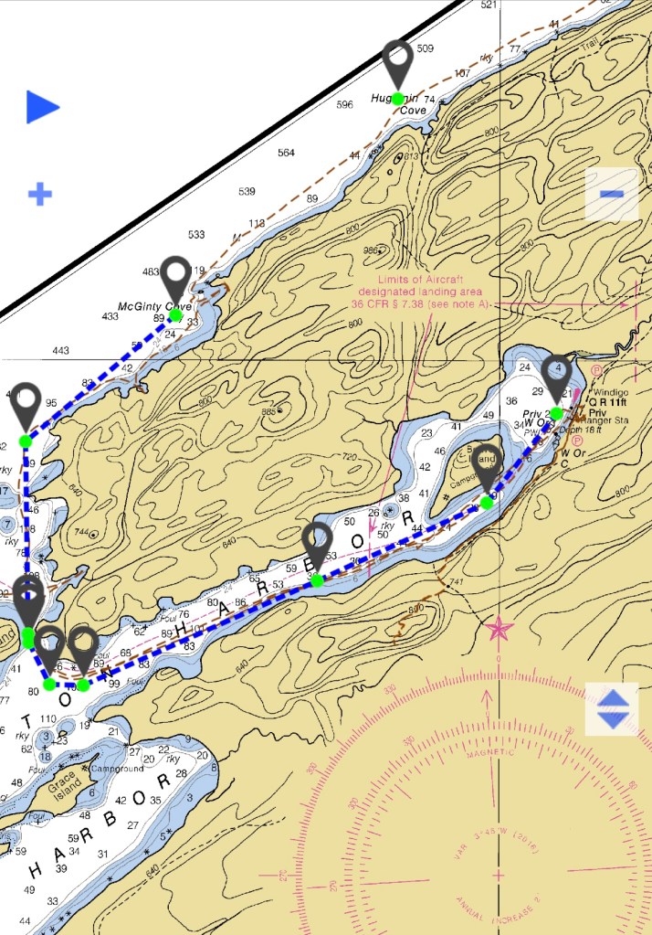 Rounding the point to head into Windigo brought us right over the shipwreck of the SS America. To read more about it go to https://www.nps.gov/isro/learn/historyculture/ss-america.htm. There was a mooring ball by it for Dive Boats and we happily took advantage of it, tying on and pulling ourselves slowly over the wreck to gaze and imagine. Almost gives a person the urge to be a diver… ho boy, I sorta hope Heath didn’t think of that because we all know what that means. I may as well start flipper shopping.
