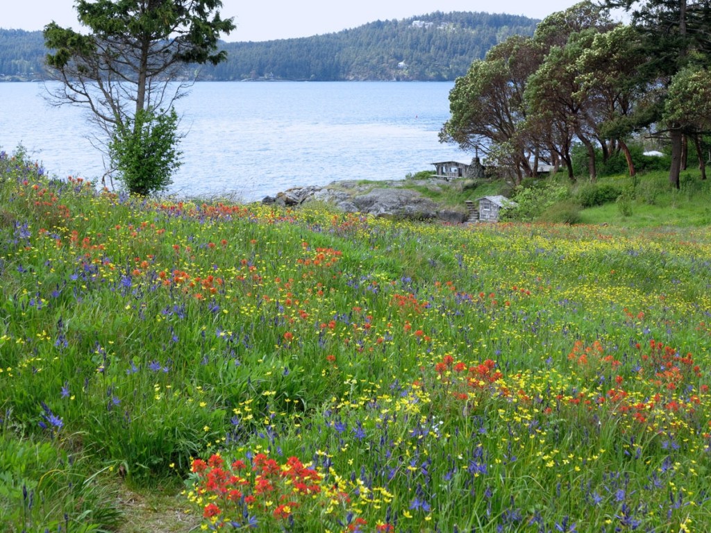 The spring flowers were a carpet of color, and we explored the whole island. It was low tide, so we could walk out and see the squishy kelp balls, peek under rocks to uncover fat orange worms that peed like a fountain when you touched them, scare the shy crabs and watch the busy life in the tide pools. Avril was fascinated by the short pieces of rebar stuck into the rock, but we never got any answers. There was an otter family playing on the rocks and some stray kayakers on the pebble beach. Signs said we shouldn’t forage or pick anything, but some rocks dropped in my pockets while Avril looked on disapprovingly. But who do you think wore a shocked expression several hours later when she dug in her own pockets? Yes. Avril had stolen rocks as well. Clearly her disapproval was only in my less than subtle ways, not in the crime itself. Perhaps I gathered a few tips and pointers, just like people do when they go to jail.