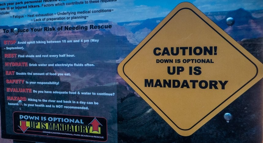 But what are they going to do? They didn’t have reservations to stay at Phantom Ranch, and those are booked out months in advance. They didn’t carry any sleeping gear or food to stay for the night. Their great idea was to start from the top early in the morning, come down, rest a bit, and then hike back out. Rim to river to rim is the bragging description.