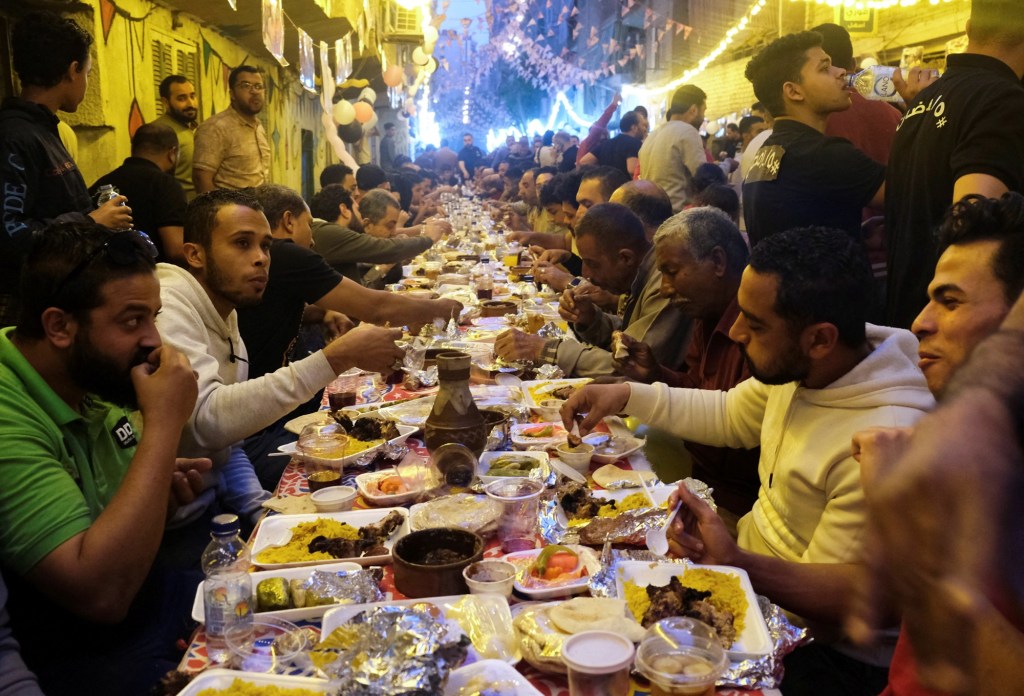 If I had to describe Egyptian cities with one word I would say “hectic”. Cairo in particular is a wild swirl of street vendors, classy shops, horses, smog, shisha bars, beggars, mini busses, ancient taxies, pastries, all overlaid with the smell of sewer and smog, and the constant cacophony of horns. Add the Islam holiday Ramadan to the mix, and you have festive lights strung between dusty buildings and trees, kids setting off hundreds of fireworks, and every evening at 5:50 the streets are filled with tables and chairs and food as people break their fast for the day. Hundreds and thousands of people, eating food out in the street. Not such great food either, but it’s free. All morning the restaurants have been cooking and compiling large plates of food for anyone who needs it. At 5:00 they set up the tables, and the chairs get steadily filled with the impoverished and those who are traveling and can’t reach home. Food is set out, and now all that must be done is wait for the evening prayer call. When the last haunting notes die away, the whole city starts eating. It’s almost surreal. No matter where you are, you stop what you’re doing and eat. We have waited for our drivers, for shop keepers, for Airport Check In counters to reopen, and at security for people to eat. Once when we were still on the road, our driver stopped at an intersection to receive juice, dates and a plate of food from a few random passersby so he could be poised and ready when the call came.