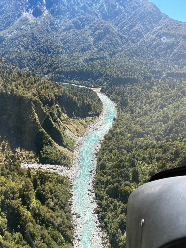 Hokitika, on the West Coast, is stunning. The waves rolling in off the Tasman Sea were huge and lovely and the lush green of the farms leading right to the mountains beautiful. It’s interesting how there are no foothills in the parts of the South Island where we were. The ground is flat as a pancake until it suddenly whooshes up into a high peak. The Hokitika Gorge, with its bright blue/teal water was our first destination, but on the road over we passed a little office in a field that said Precision Helicopter Tours on it. No Heli was in sight, but there was an older man mowing the grass and the parking lot had three dogs in it, one lying very much centered in the handicapped parking spot. A cheerful middle aged woman was there and after chatting a little, her and Heath had a perfect little helicopter ride figured out. A shorter ride, I think she said 15-20 minutes, to a close glacier with a touchdown on the mountain top. Excellent! She sent her daughter Lily, age 28, for the helicopter and we did the preflight paper work, which was pretty much limited to our names and our weights. Come to think of it, I don’t think we signed any type of waver.