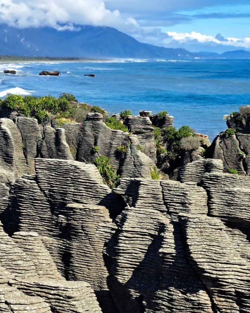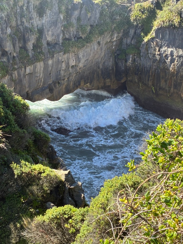 Pancake Rocks and the Blowholes was supposed to be our furthest North destination. It was pretty cool, though I’m not even sure how to describe it. It’s a large area of jagged spiky rocks that have eroded underneath and the sea comes sweeping in. As it thunders into the various pools and under rock bridges, it sometimes splashes way up or makes a deep booming sound. You can feel the impact on the pathways above.