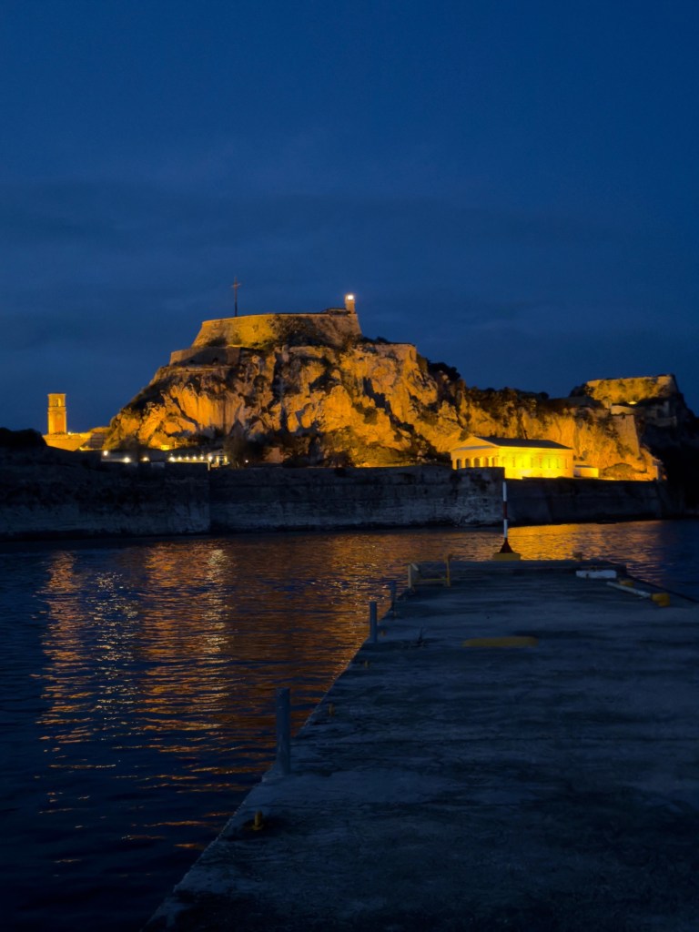 Evening brought us back to Corfu town with its little cobbled streets, outdoor restaurants and people hanging around in the town square. A definite outdoor culture here! One last stop quick before total dark at the Holy Monastery of Planagia Vacherna, a tiny monastery surrounded by water and incidentally right at the end of the modern runway of Corfu airport. Me thinks the meditation probably doesn’t go quite as good as it used to. It’s the oldest monastery on Corfu, and I’m gonna say has the most ducks and cats to human ratio of any other monastery on the Island. Clearly these monks are animal lovers. There was a row of cardboard boxes sitting on the front steps, a nice variety of sizes, and in each one there sat a cat. It was epic! They certainly didn’t choose their boxes according to box and body size. Oh no. Some were swimming with room, others appeared to be a rather tight fit, but as they say, be it ever so humble, there is no place like home.