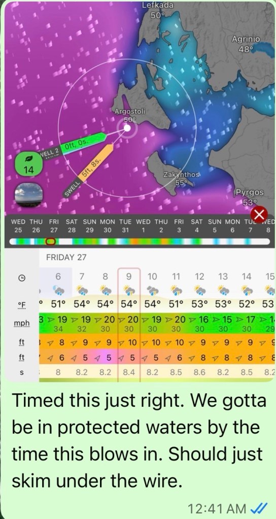 As you can see from a message I shot the kids, things were gonna get rather uncomfortable. We needed to be out of the purple area and into the calm blue stuff as soon as reasonable. In this case, it wasn’t the wind but the waves that were a concern. They had the whole expanse of the Ionian Sea to build as the storm started near Italy.